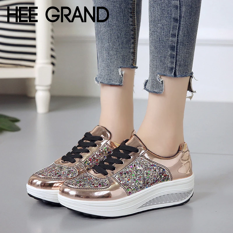 Vente Meilleur HEE GRAND Plate Forme Creepers Bling Glitter Chaussures Femme Dentelle Up Casual Mocassins De Mode Femmes Appartements Chaussures Taille 35 41 XWC1429 Pas Cher En Ligne.